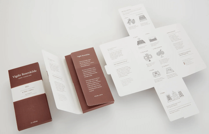 Emballasjen er laget av resirkulert papir med tekstur, og i emballasjen kan man lære om prosessene fra kakaofrukt til sjokoladeplate.
