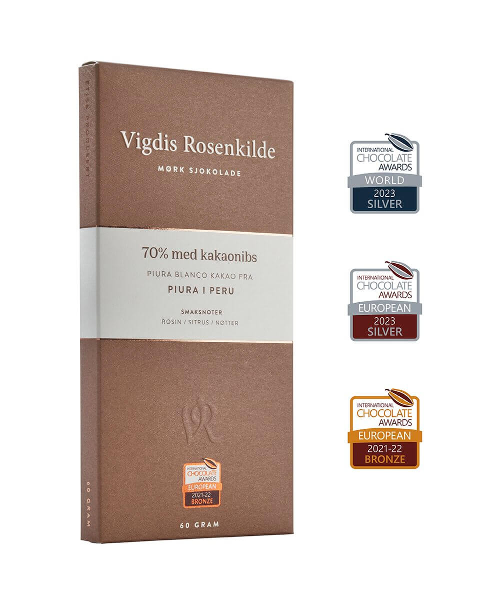 Fordi Piura Blanco er så mild egner den seg godt som nibs. Nibs er biter av kakaobønner som gir et deilig knasende innslag i denne sjokoladeplaten.