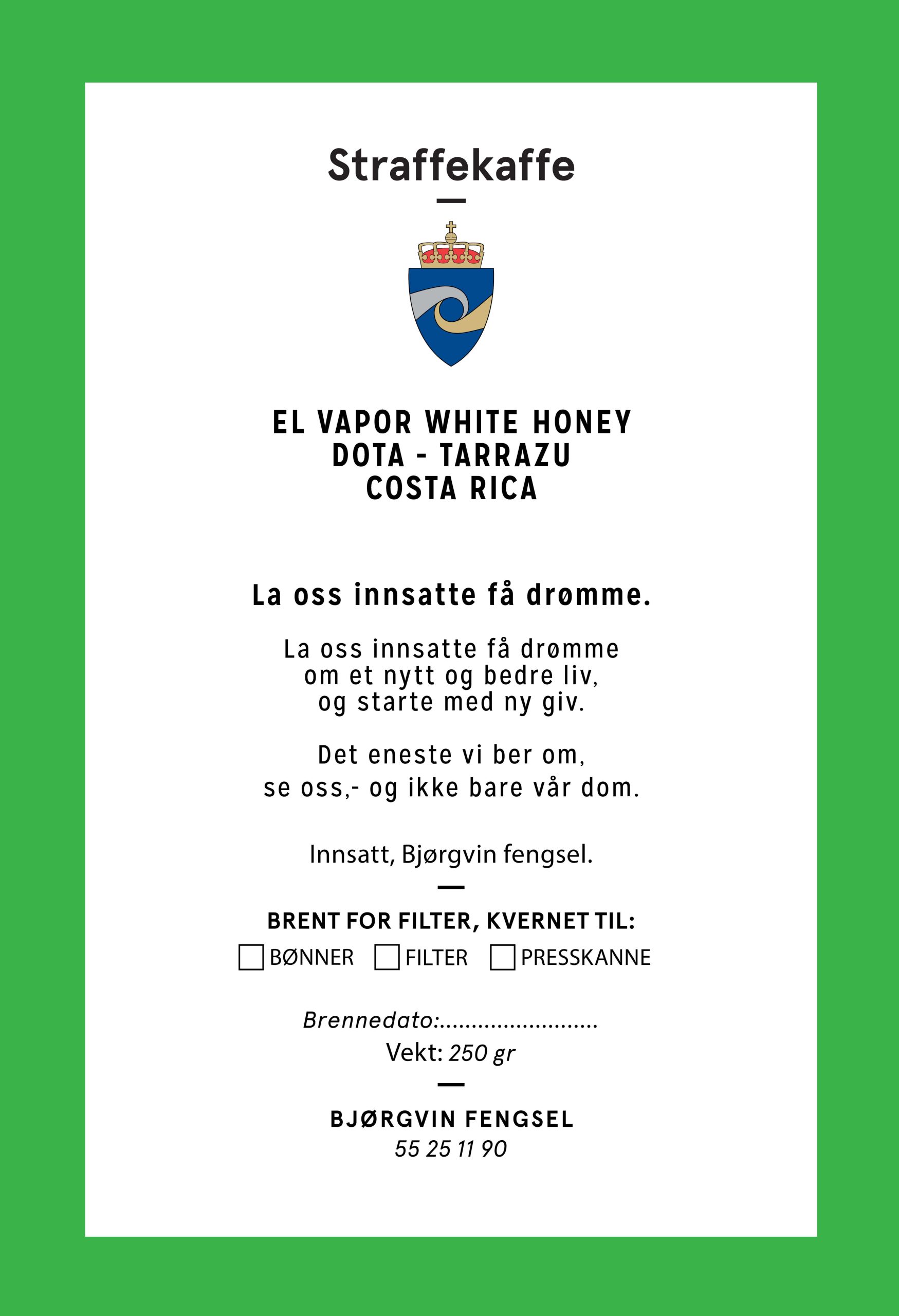 Straffekaffe er Kriminalomsorgens egen kaffemerkevare. Kaffen du kjøper er brent, kvernet og pakket av innsatte i samarbeid med ansatte i Bjørgvin fengsel rett utenfor Bergen. Kaffeproduksjonen er ikke bare til for at ansatte og innsatte skal drikke god kaffe.